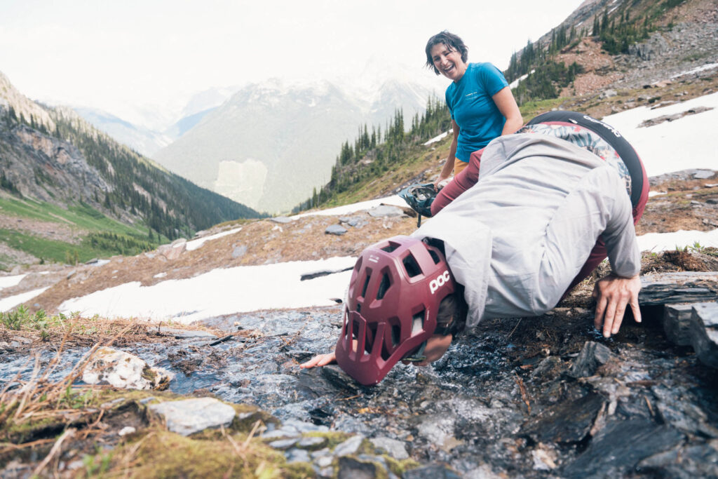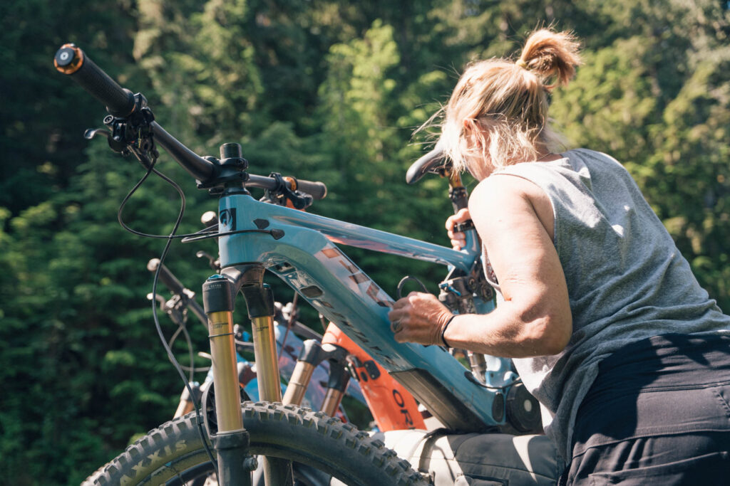 On that Friday in mid-July, we loaded the eMTBs into two trucks and headed east from our base at the Windsor Hotel in Trout Lake. For about an hour we followed a network of forest service roads to the bottom of the Triune Mine trail. Jen, Anne, Kim, Larry, myself and our logistics crew – Jen, Brenda and Charity, all headed out for the trial run. The plan was to start the ride together, and based on everyone’s comfort level on the ascent, we’d decide who’d keep going and who would turn back. We always respect the ‘buddy system’ out here in the BC backcountry, meaning no one rides alone. If one person goes back, another joins them. Whether it’s grizzly bears, mechanical misfortune or a ‘biomechanical’ – there’s always a buddy on hand.