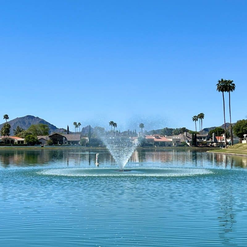 Despite pedaling through endless evidence of human development, the natural beauty of the route was still breathtaking. We enjoyed the sound of rushing water in the canals, the desert cacti and blowing sand in the outer reaches, views of the mountains in the distance, the green grass and fountains of the golf courses, and the artificial yet still beautiful display of falling water at Arizona Falls.